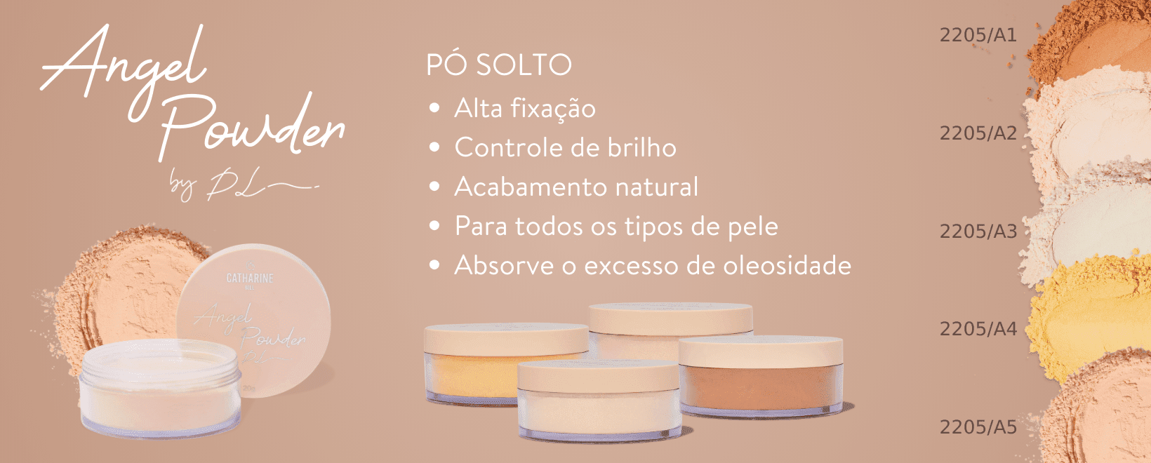 Desenvolvido para todos os tons de pele, o Angel Powder está disponível em cinco tonalidades e garante uniformidade e naturalidade no acabamento.
